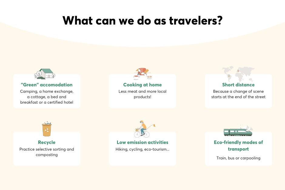 - Activities: tourism activities are the second most important measure for reducing emissions during a trip and can account for up to 62% of the total footprint.
