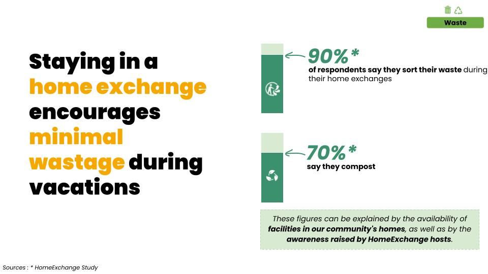 - Waste: HomeExchangers are particularly sensitive to waste management which, although small in the overall carbon footprint, remains a key issue for biodiversity!