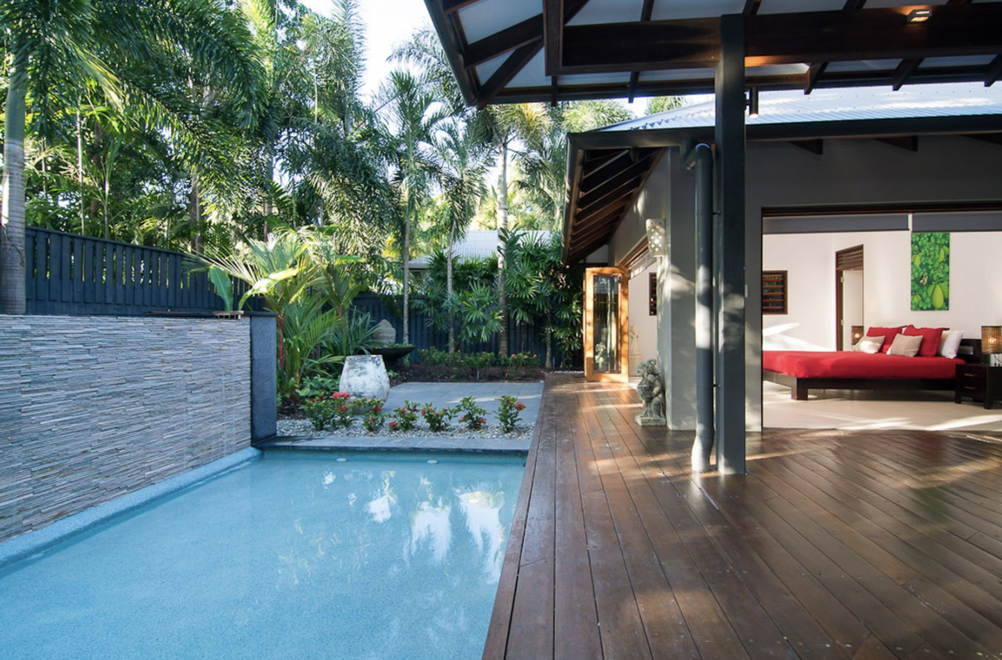 Comfortable living areas, wading and swimming pools, and an outdoor entertainment area make this Queensland vacation home an idyllic destination. The house is a short walk from the nearest beach, for guests who can tear themselves away from the deluxe amenities and pools the home offers!