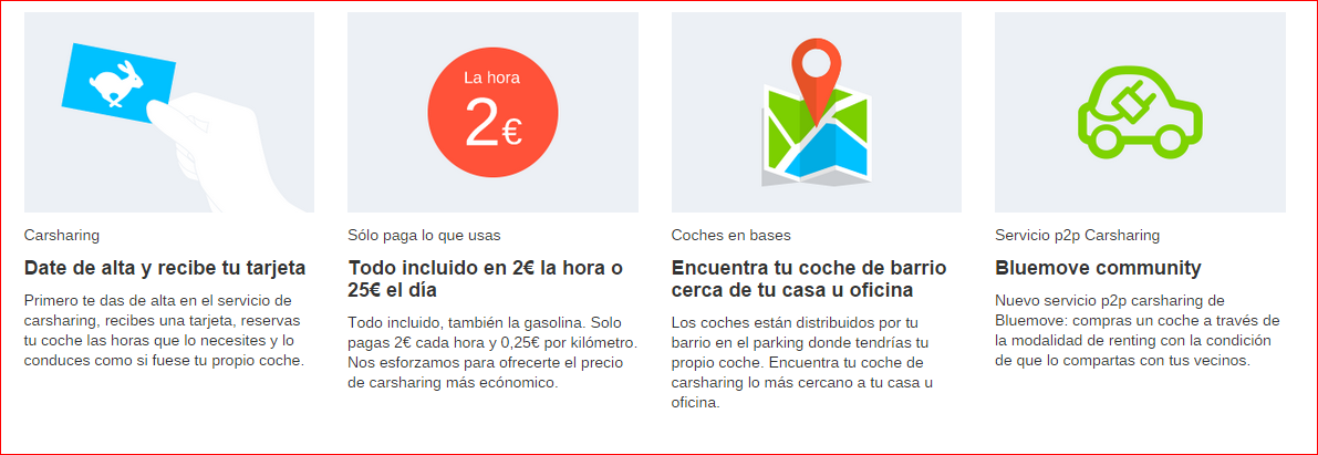 Muchos de tus vecinos probablemente tengan su coche aparcado en la calle o en un garaje sin ser usados. Gracias a Bluemove puedes alquilar por horas estos coches siempre que lo necesites por 2 euros la hora (incluida la gasolina) más 0,25 céntimos el kilómetro recorrido o alquilar un coche durante todo un día por 25 euros en total.