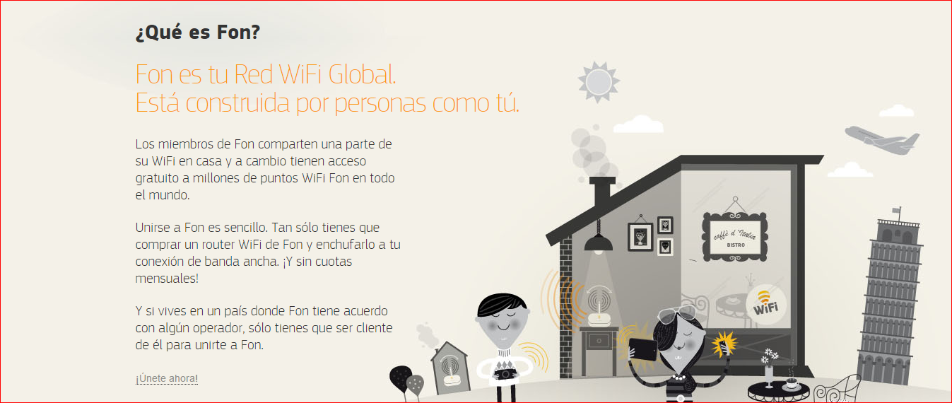 ¿Estás cansado en no tener internet allá donde vayas? ¡Fon es la solución! Se trata de la red WiFi más grande del mundo. Para ser miembro de esta página sólo tienes que compartir una parte de tu conexión a internet en casa (gracias a una señal que Fon instala en tu router). De esta manera podrás utilizar el WiFi de otros miembros de Fon siempre que lo necesites. Otra opción es comprar “un pase” para utilizar Fon en momentos determinados sin tener que compartir tu conexión WiFi. No obstante, Fon se trata de un sistema seguro en el que, aunque compartas tu WiFi, tienes privacidad y prioridad en relación a los otros usuarios.