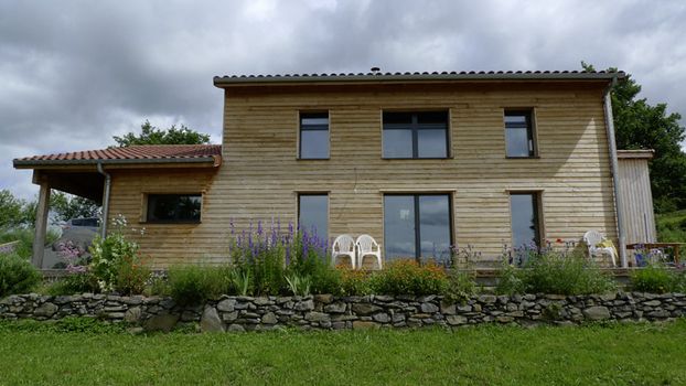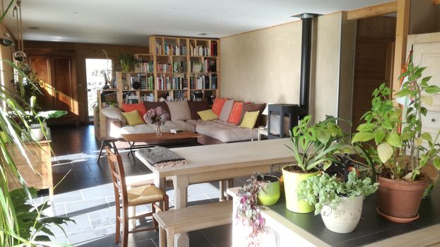 Las paredes macizas de este chalet están aisladas con fardos de paja recubiertos de arcilla y encalados. Su objetivo es mantener la casa caliente en invierno y fresca en verano. Los materiales artesanales de este lugar han sido elegidos para minimizar el impacto ecológico: paja, arcilla y cal, pero también madera reciclada y ladrillos procedentes de una antigua fábrica de las cercanías.