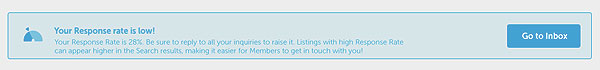 Si tu tasa de respuesta no es buena, no pasa nada y también pensamos en ti. Sabemos que no siempre es fácil estar al día con la respuesta a todas las propuestas recibidas y, para que sea más sencillo, hemos incluido notificaciones que te alertan cuando tu tasa está baja. Al acceder a tu cuenta, verás una alerta que te indica que la tasa ha bajado. Haz click en tu mensajería y contesta a los posibles partners para decirles si sus propuestas te interesan o no. A medida que lo vayas haciendo, la tasa subirá. ¡Fácil!