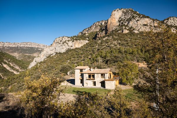 Casa sostenible en plena naturaleza, rodeada de montañas y bosques.