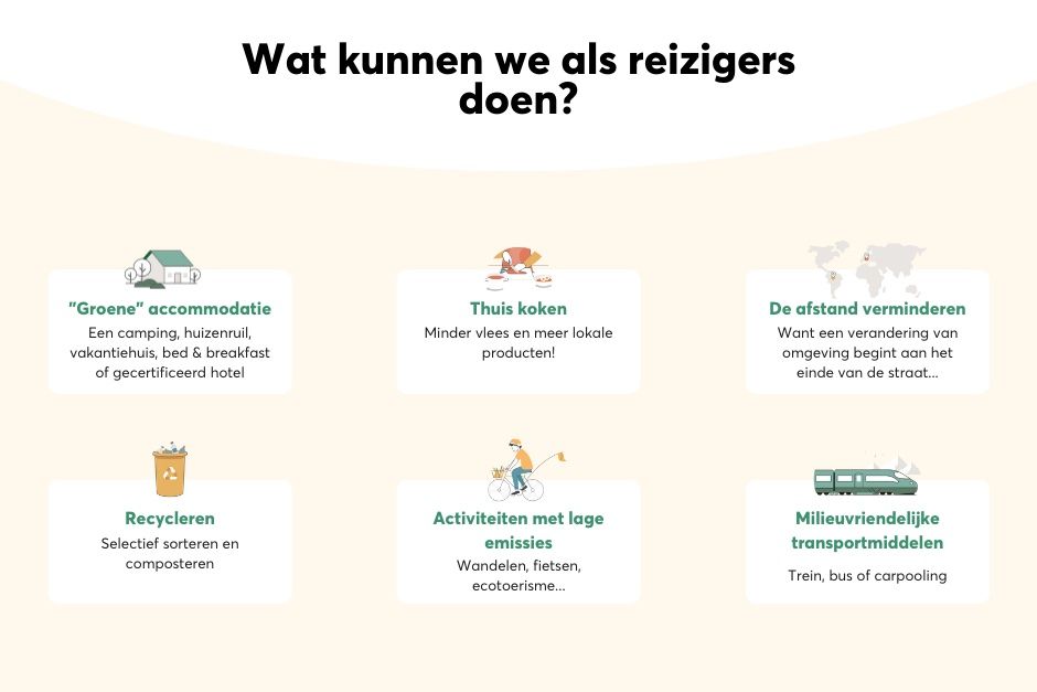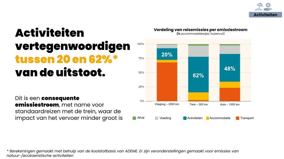 - Activiteiten: toeristische activiteiten zijn de tweede belangrijkste factor om de uitstoot tijdens een reis te verminderen en kunnen tot 62% van de totale voetafdruk vertegenwoordigen.