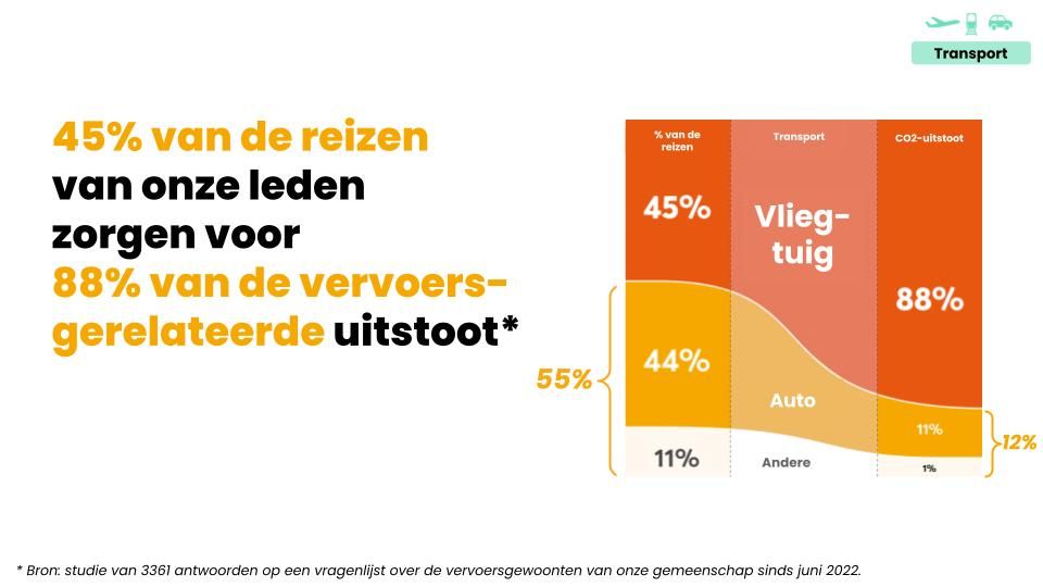 - Transport: de voornaamste vervoersmiddelen van de HomeExchange-gemeenschap zijn het vliegtuig (45%) en de auto (44%): transport (middelen en afstand) is dus de belangrijkste manier om de CO2-impact van de gemeenschap te verminderen.