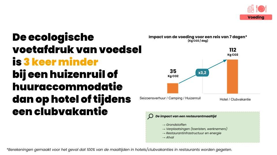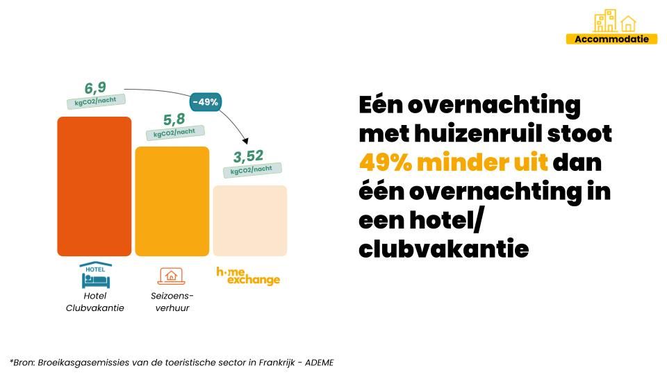 - Accommodatie: kiezen voor een huizenruil is 49% minder milieubelastend dan een verblijf in een hotel of clubvakantie.